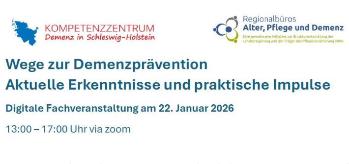 Digitale Fachveranstaltung am 22. Januar 2026 13:00 – 17:00 Uhr via zoom Demenzprävention betrifft uns alle. Doch was wirkt wirklich? Welche Lebensphasen sind entscheidend – und wie lassen sich verlässliche Informationen verständlich in der Beratung vermitteln? Unsere digitale Fachveranstaltung richtet sich an Multiplikator:innen in der Versorgung, die ihre Informations- und Beratungskompetenz im Themenfeld Demenzprävention stärken […]