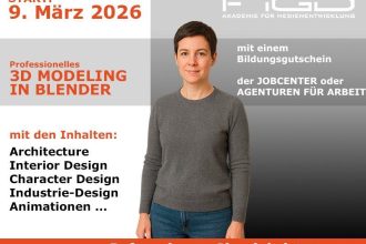 Ihre Karriere im 3D-Bereich beginnt hier Am 09. März 2026 startet die praxisorientierte Vollzeit-Weiterbildung „Professionelles 3D Modeling in Blender“. In einer zunehmend digitalisierten Medien- und Kreativwirtschaft sind hochwertige 3D-Visualisierungen, Animationen und interaktive Mediensysteme gefragter denn je. Ob in Architektur, Interior Design, Character Design, Industrie-Design oder im Bereich Games und Animation – fundierte 3D-Kompetenzen eröffnen Ihnen […]