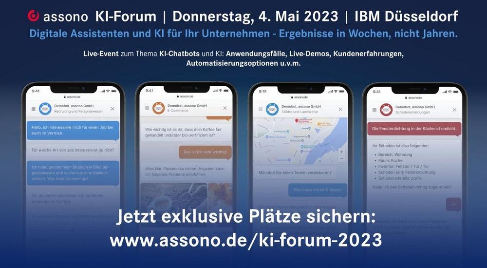 Das assono KI-Forum ist ein exklusives Event für Entscheider und Projektverantwortliche für Digitalisierungsvorhaben. Nach den ausgebuchten assono KI-Foren in Hamburg und München geht es nun im Mai in Düsseldorf in die mittlerweile sechste Runde. Es erwarten Sie spannende Vorträge sowie ein reger Austausch und die Möglichkeit zum Netzwerken. Erfahren Sie alles über KI-Chatbots: Anwendungsfälle, Live-Demos, Kundenerfahrungen, Automatisierungsoptionen und was noch alles mit KI für Unternehmen heute schon möglich ist.