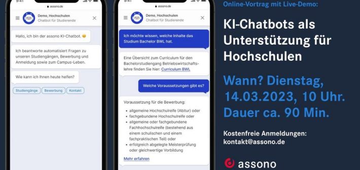 Am 14. März um 10 Uhr haben wir einen Online-Austausch zum Thema „Nutzen von KI-Chatbots für Hochschulen“ geplant. In dem kostenlosen Zoom-Meeting sprechen unsere Chatbot-Experten mit Ihnen über die Vorteile eines KI-Chatbots für Hochschulen, teilen Erfahrungswerte aus der Praxis und zeigen Ihnen eine Live-Demo. „Wann endet die Bewerbungsfirst? Welchen NC hat der Studiengang BWL? Wie […]