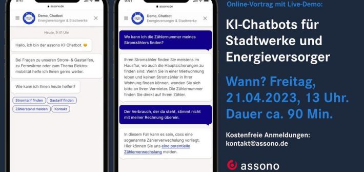 Am 21. April um 13 Uhr haben wir einen Online-Austausch zum Thema „Nutzen von KI-Chatbots für Stadtwerke und Energieversorger“ geplant. In dem kostenlosen Zoom-Meeting sprechen unsere Chatbot-Experten mit Ihnen über die Vorteile eines KI-Chatbots für Stadtwerke und Energieversorger, teilen Erfahrungswerte aus der Praxis und zeigen Ihnen eine Live-Demo. „Wie setzen sich die Energiepreise zusammen? Wie […]