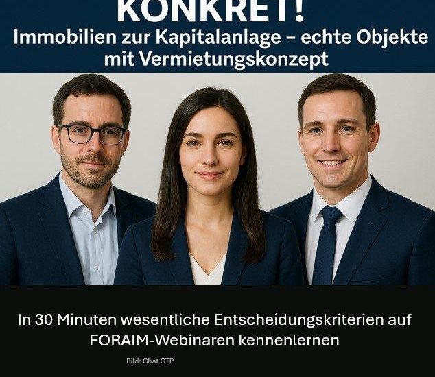 FORAIM ist ein spezialisiertes Finanzberatungsunternehmen für Privatkunden und Freiberufler, das sich auf maßgeschneiderte Anlage- und Vorsorgestrategien konzentriert. Im Mittelpunkt steht eine detaillierte Liquiditäts- und Kapitalplanung, bei der die individuelle Lebenssituation ebenso berücksichtigt wird wie steuerliche Rahmenbedingungen. FORAIM vermittelt gezielt konkrete Kapitalanlagen – auch Immobilien –, die nachvollziehbar zur persönlichen Finanzstrategie passen. Das Webinarformat KONKRET! steht für Praxisnähe, Zahlenklarheit und reale Entscheidungsgrundlagen statt theoretischer Modelle.