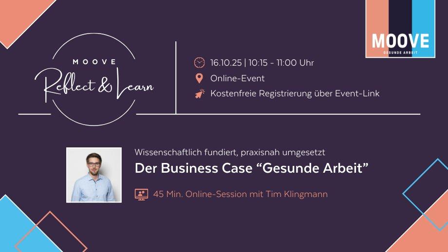 Nutzt MOOVE Reflect & Learn – unser interaktives Online-Format für HR- und BGM-Verantwortliche – um den Status Quo in eurem Unternehmen zu reflektieren, euch mit Gleichgesinnten und Expert:innen dazu auszutauschen und von diesen dazuzulernen.