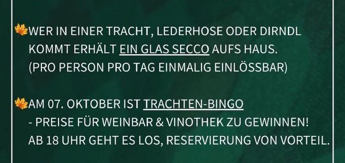 Special: Trachten-Bingo – Preise für Weinbar und Vinothek zu gewinnen! Ab 18 Uhr geht es los, Reservierung von Vorteil. Jeden ersten Dienstag im Monat heißt es bei uns „BINGO“! Am 07.10.2025 begrüßen wir unsere Gäste zu einer Sonderedition im Trachtenlook. Wer in einer Lederhose oder Dirndl kommt erhält ein Glas Secco aufs Haus. […]