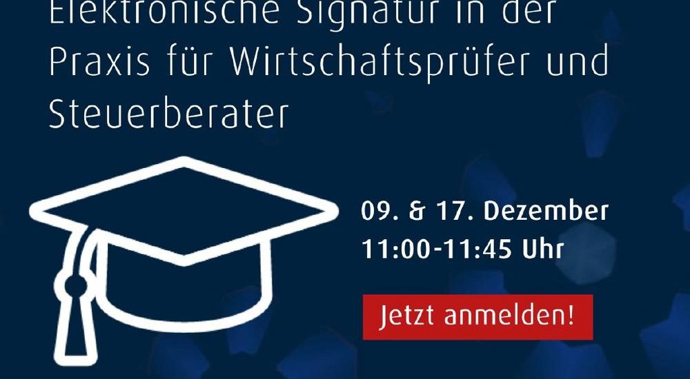 In unseren kostenlosen Webinaren am 9. und 17. Dezember 2025 erfahren Sie, wie Sie elektronische Signaturen im Bereich der Wirtschaftsprüfung und Steuerberatung praktisch in Ihre Abläufe integrieren, und Sie haben Gelegenheit, konkrete Fragen zu stellen.