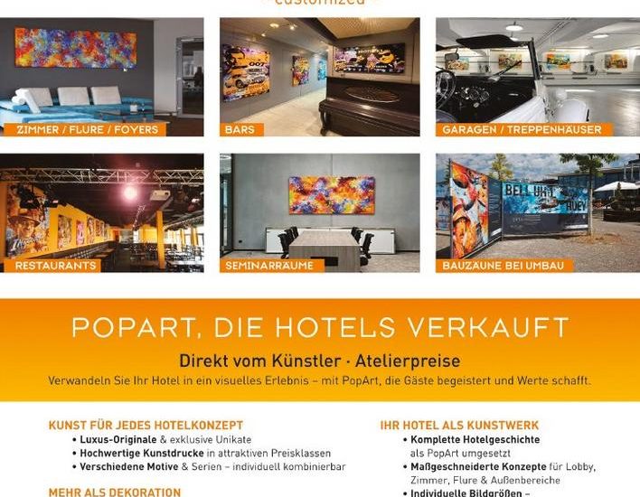 Die PopArt-Werke von Bernd Luz sind wiederverkaufsfähig wie Galerie-Kunst und können gekauft oder auch gemietet werden – einzeln oder als komplette Ausstellung. Damit wird Kunst nicht nur zu einem ästhetischen, sondern auch zu einem wirtschaftlichen Asset. Hotels können ihre Räume so als Markenerlebnis inszenieren, das Gäste emotional bindet und zugleich als Investment fungiert.
