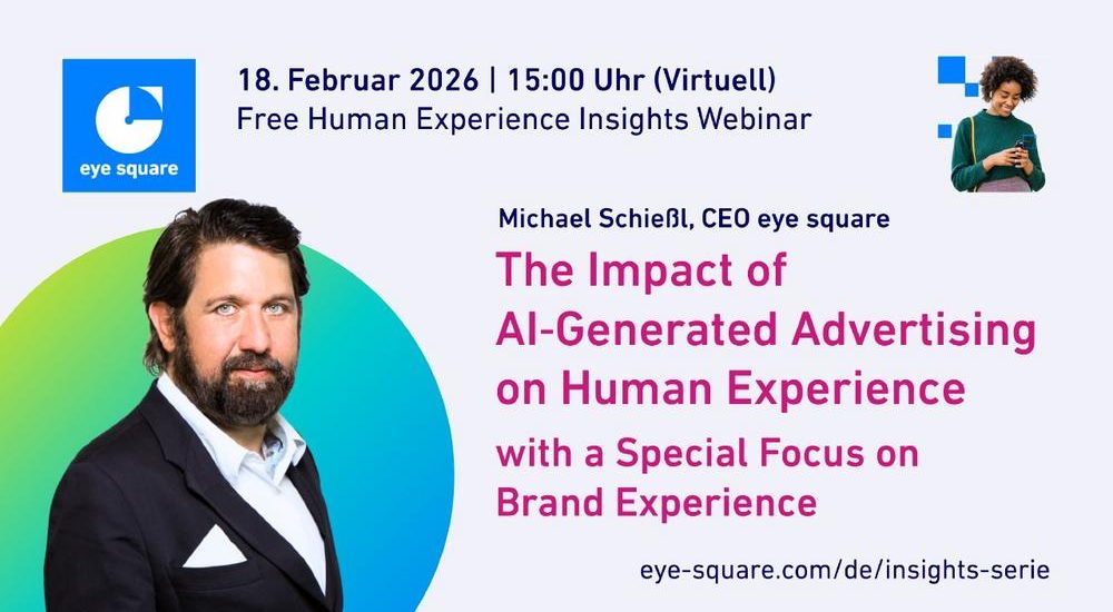 In unserem Webinar am 18. Februar wird eye square CEO Michael Schießl die Auswirkungen von KI-generierter Werbung auf die menschliche Erfahrung beleuchten. Wir analysieren, wie der Einsatz von KI das Verbraucherverhalten, Emotionen und Engagement von Konsumenten beeinflussen. Dazu gehören psychologische und soziologische Aspekte sowie ethische Fragestellungen und mögliche Verzerrungen.