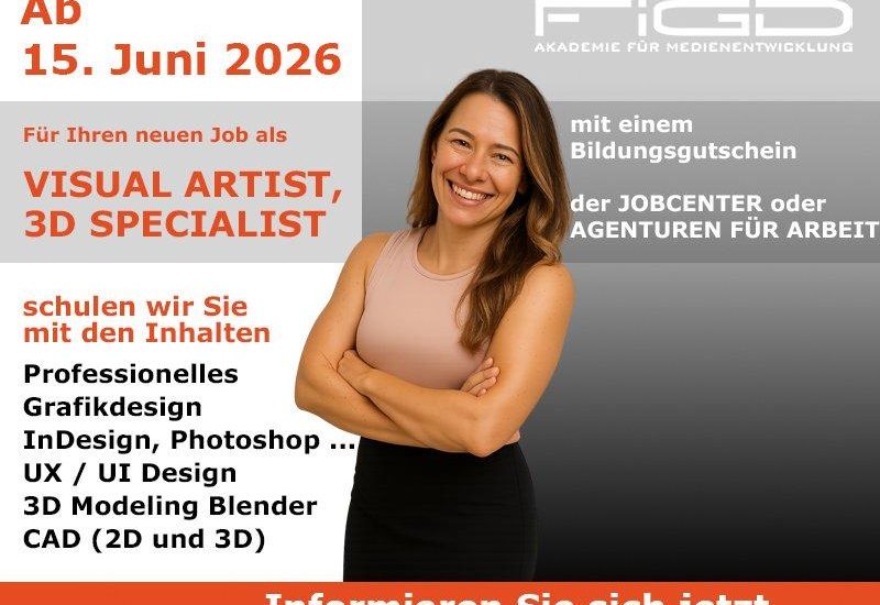 Wer kreative Gestaltung, digitale Medienproduktion und 3D-Entwicklung in einem modernen Berufsfeld verbinden möchte, findet mit der Weiterbildung zum Visual Artist / 3D Specialist an der FiGD Akademie eine praxisnahe und arbeitsmarktorientierte Qualifizierung. Die Weiterbildung wird in Präsenz durchgeführt und richtet sich an Menschen, die sich professionell in den Bereichen visuelle Kommunikation, digitale Medien, 3D-Visualisierung und kreative Systementwicklung weiterentwickeln möchten. Besonders attraktiv ist dabei die Möglichkeit, die Weiterbildung über den Bildungsgutschein vollständig fördern zu lassen.