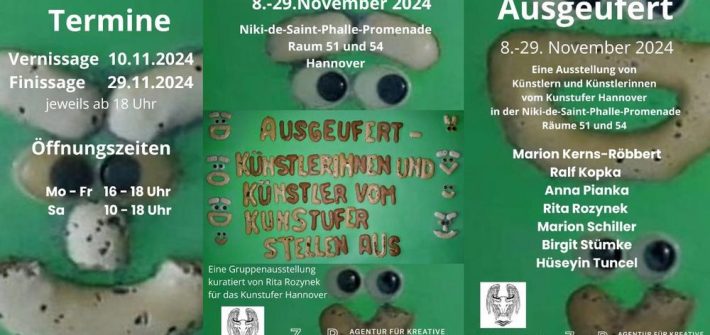 Die Kunstufer-Saison ist beendet, aber die kreative Reise geht weiter! Sieben Kunstschaffende vom Kunstufer Hannover präsentieren in der gemeinsamen Ausstellung „Ausgeufert“ ihre Werke und laden herzlich dazu ein, die Vielfalt ihrer Kunst in zentraler Lage zu entdecken. Am 10.11.2024 findet um 18Uhr die Vernissage statt. Künstler*innen der Ausstellung: Marion Kerns-Röbbert Ralf Kopka Anna Pianka Rita […]
