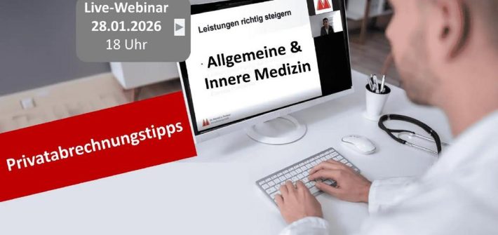 Privatabrechnungs-Seminar für Allgemeinmediziner und Internisten am 28.01.2026 Live-Webinar “Privatabrechnungstipps für den Fachbereich Allgemeine & Innere Medizin” Ihr Nutzen Sie erfahren anhand von Praxisbeispielen, welche Honorareinbußen durch Dokumentationslücken entstehen, wie ausführliche Beratungen, ein Behandlungsfall und Sachkosten bestmöglich abgerechnet werden können und erhalten eine Übersicht in den großen und kleinen Gebührenrahmen. Die passende und „adäquate“ Anwendung des Steigerungssatzes […]