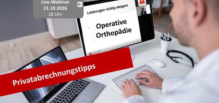 Live-Webinar für die Fachbereiche Orthopädie, Unfallchirurgie und Neurochirurgie am 21.10.2026 Ihr Nutzen Sie erhalten Tipps für eine optimale Abrechnung operativer Leistungen unter Beachtung des im §4 Abs. 2a der GOÄ beschriebenen Zielleistungsprinzips sowie auf Basis einer vollständigen OP-Dokumentation. Profitieren auch Sie von unserer über 50-jährigen Erfahrung im Bereich der Privatabrechnung, basierend auf unserer Betreuung und […]
