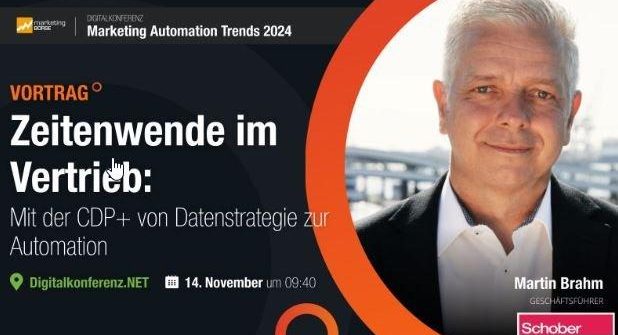 Die Digitalkonferenz „Marketing Automation Trends 2024“ am 14. November 2023 rückt näher und damit auch unser Vortrag um 9:40 Uhr: „Zeitenwende im Vertrieb: Mit der CDP+ von Datenstrategie zur Automation“von und mit Martin Brahm, Geschäftsführer bei der Schober Information Group Und das erfahren Sie in diesem Vortrag: Was ist das „plus“ hinter der CDP+ und […]
