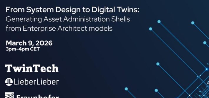 Together with our partners TwinTech and Fraunhofer IESE, we cordially invite you to attend the webinar ‘From System Design to Digital Twins: Generating Asset Administration Shells from Enterprise Architect models’ on Monday, 9 March 2026 (3:00 p.m. – 4:00 p.m.). Digital twins are still developed in parallel to existing engineering models, using specialized tooling for […]