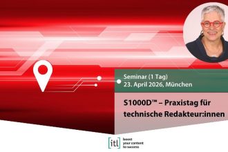 S1000D™ – Praxistag für technische Redakteur:innen23. April 2026, MünchenReferentin: Pia Grubitz An diesem Tag können Sie Ihr neues Wissen aus dem S1000D™-Grundlagen-Seminar (siehe: https://www.itl.eu/de/akademie/grundlagenseminar-zur-spec-asd-s1000dtm) praktisch üben. Wir erstellen und bearbeiten Datenmodule mit einfachen bis komplexen Strukturen. Als Werkzeug können Sie einen beliebigen XML-Editor verwenden. Falls Sie Arbortext Editor oder FrameMaker verwenden, kann ich Sie während des […]