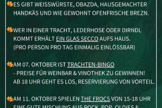 Special: Trachten-Bingo – Preise für Weinbar und Vinothek zu gewinnen! Ab 18 Uhr geht es los, Reservierung von Vorteil. Jeden ersten Dienstag im Monat heißt es bei uns „BINGO“! Am 07.10.2025 begrüßen wir unsere Gäste zu einer Sonderedition im Trachtenlook. Wer in einer Lederhose oder Dirndl kommt erhält ein Glas Secco aufs Haus. […]