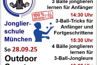 Am Sonntag, 28. September, verwandelt sich der Olympiapark München wieder in eine riesige Outdoorsport-Arena. Zum achten Mal warten beim Outdoorsportfestival den ganzen Tag über mehr als 50 Outdoor-Aktivitäten darauf, kennengelernt, getestet und vor allem direkt ausprobiert zu werden! Die Jonglierschule München ist als Aussteller dabei und bietet verschiedene GRATIS -Jonglier-Workshops für verschieden Zielgruppen an: 13:30 Uhr – 3 Bälle jonglieren lernen […]