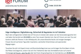 Edge Intelligence: Digitalisierung, Sicherheit & Regularien im IoT-Zeitalter Nach dem erfolgreichen Auftakt im letzten Jahr setzen Janz Tec und Kontron die Veranstaltungsreihe fort – und laden herzlich an Janz Tecs neuen Standortein. Das IoT-Forum stellt die Themen in den Mittelpunkt, die Industrie heute und morgen bewegen. Geplant ist ein Tag voller Inspiration, wertvoller Erkenntnisse und […]