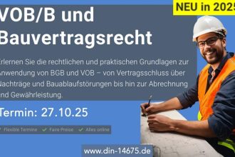 VOB/B und Bauvertragsrecht Erlernen Sie die rechtlichen und praktischen Grundlagen zur Anwendung von BGB und VOB – von Vertragsschluss über Nachträge und Bauablaufstörungen bis hin zur Abrechnung und Gewährleistung. Das erfahren Sie in der Onlineschulung: [*]Vertragsschluss[*]VOB und BGB im Bauvertrag[*]Nachtragsprüfung – Grundlagen[*]VOB gerecht ausschreiben[*]Preiskalkulation – Grundlagen[*]Nachträge im Einheitspreisvertrag[*]Nachträge im Pauschalpreisvertrag und bei Leistungen […]